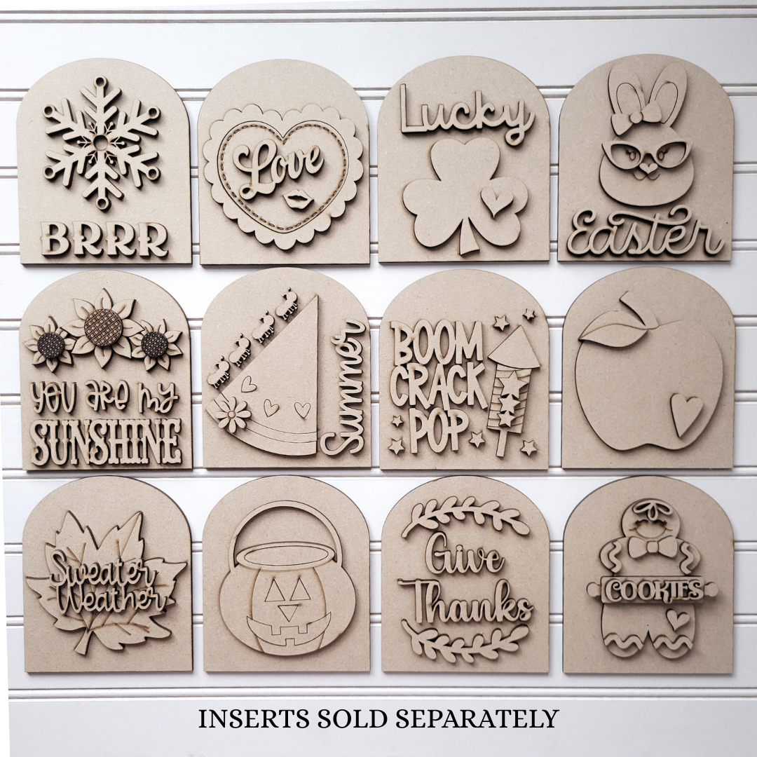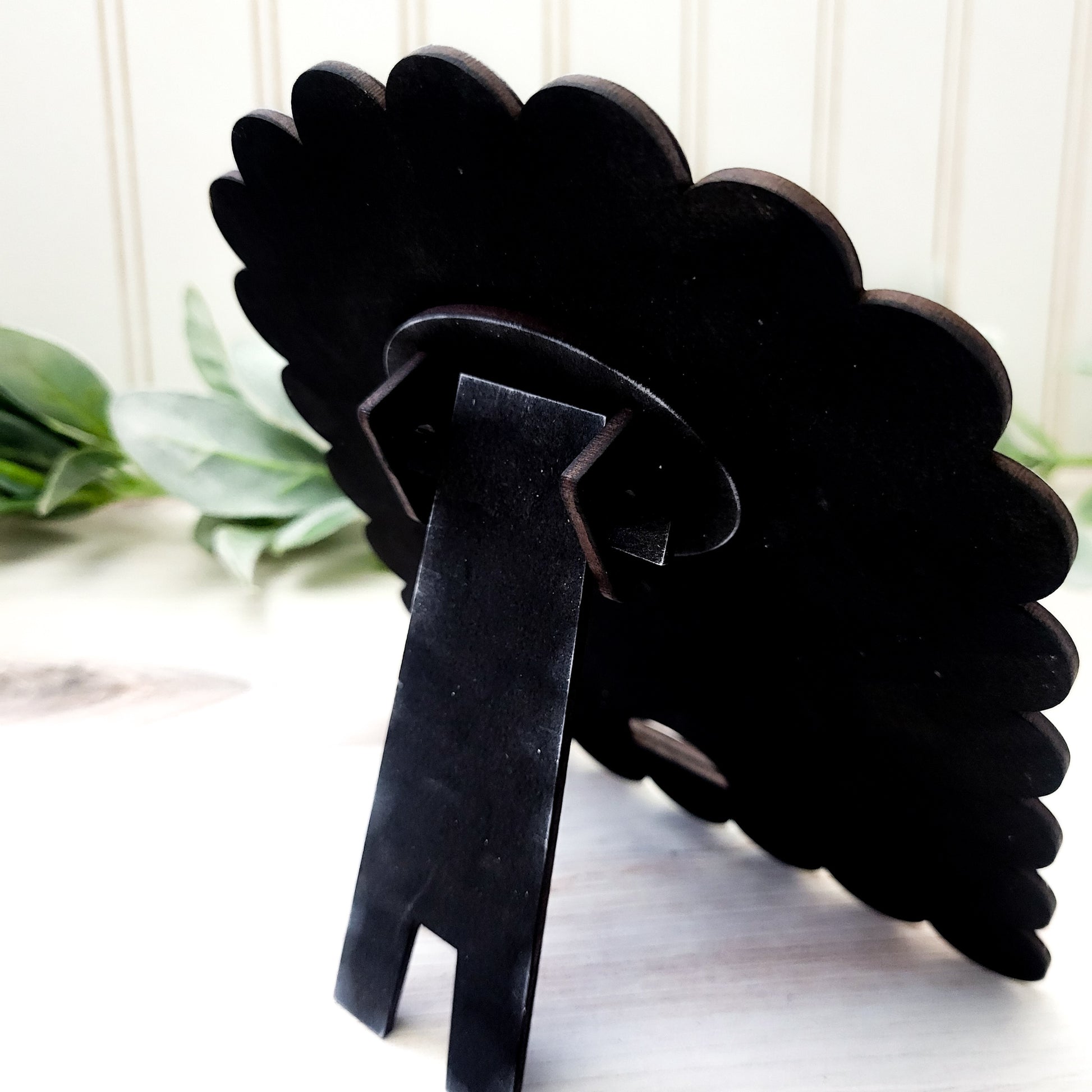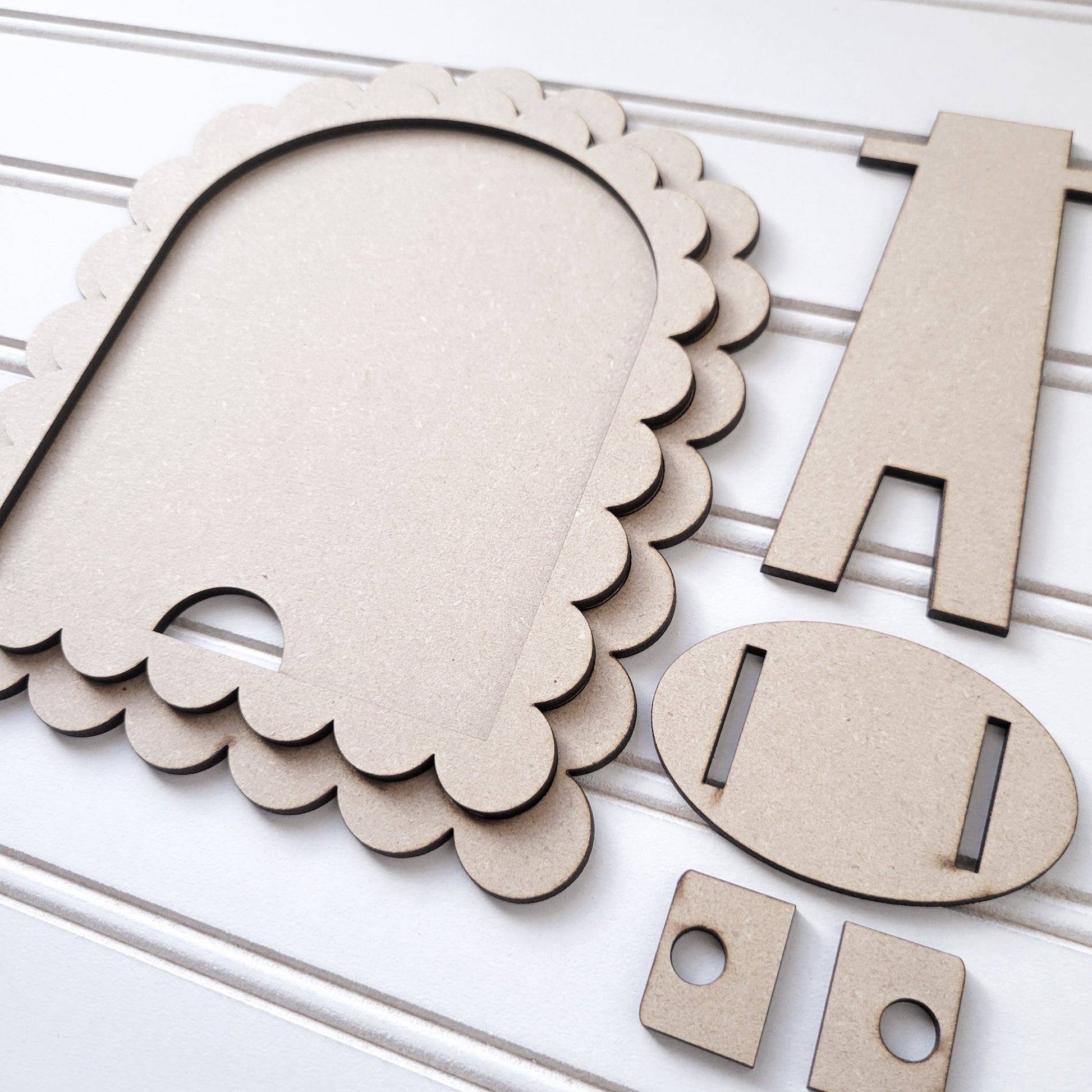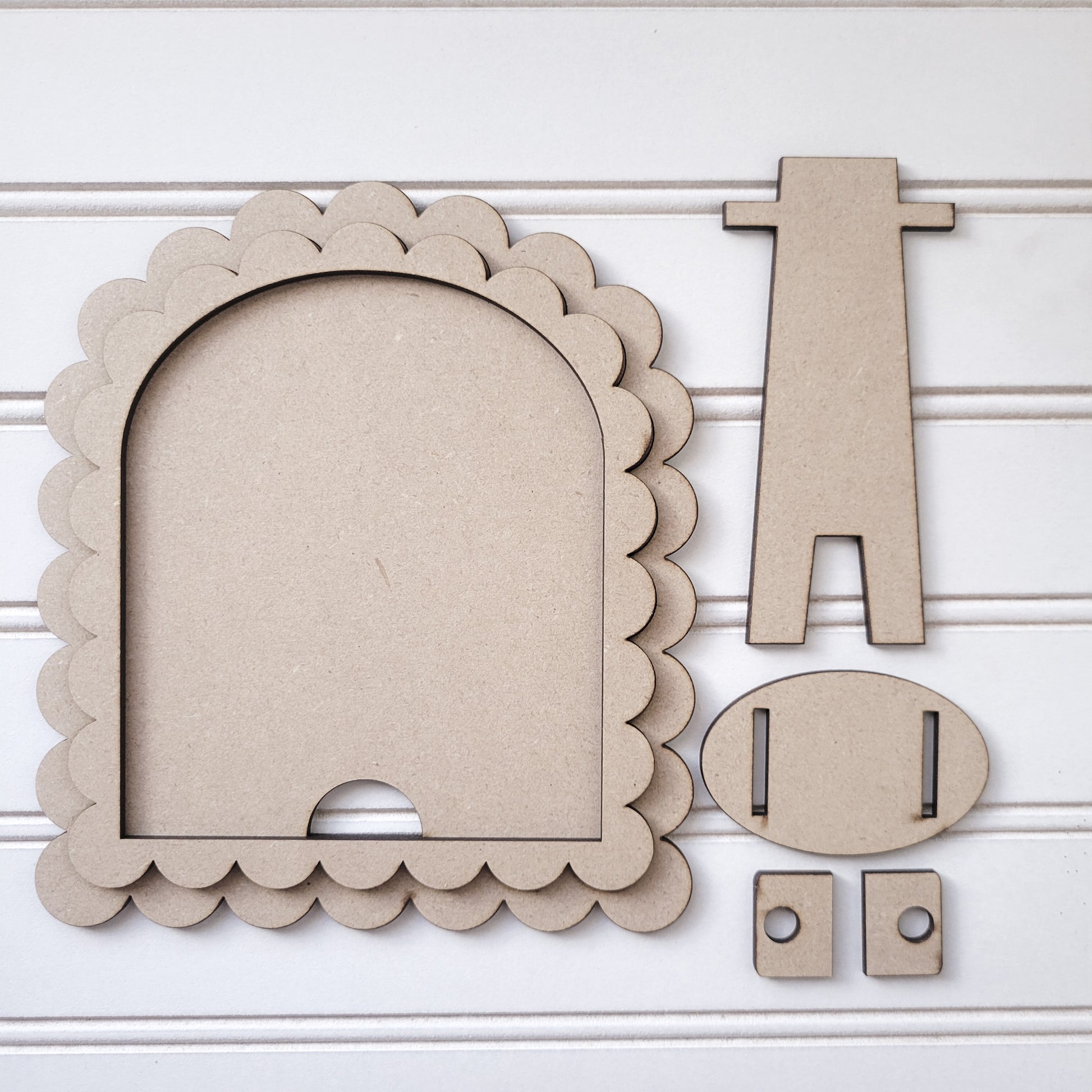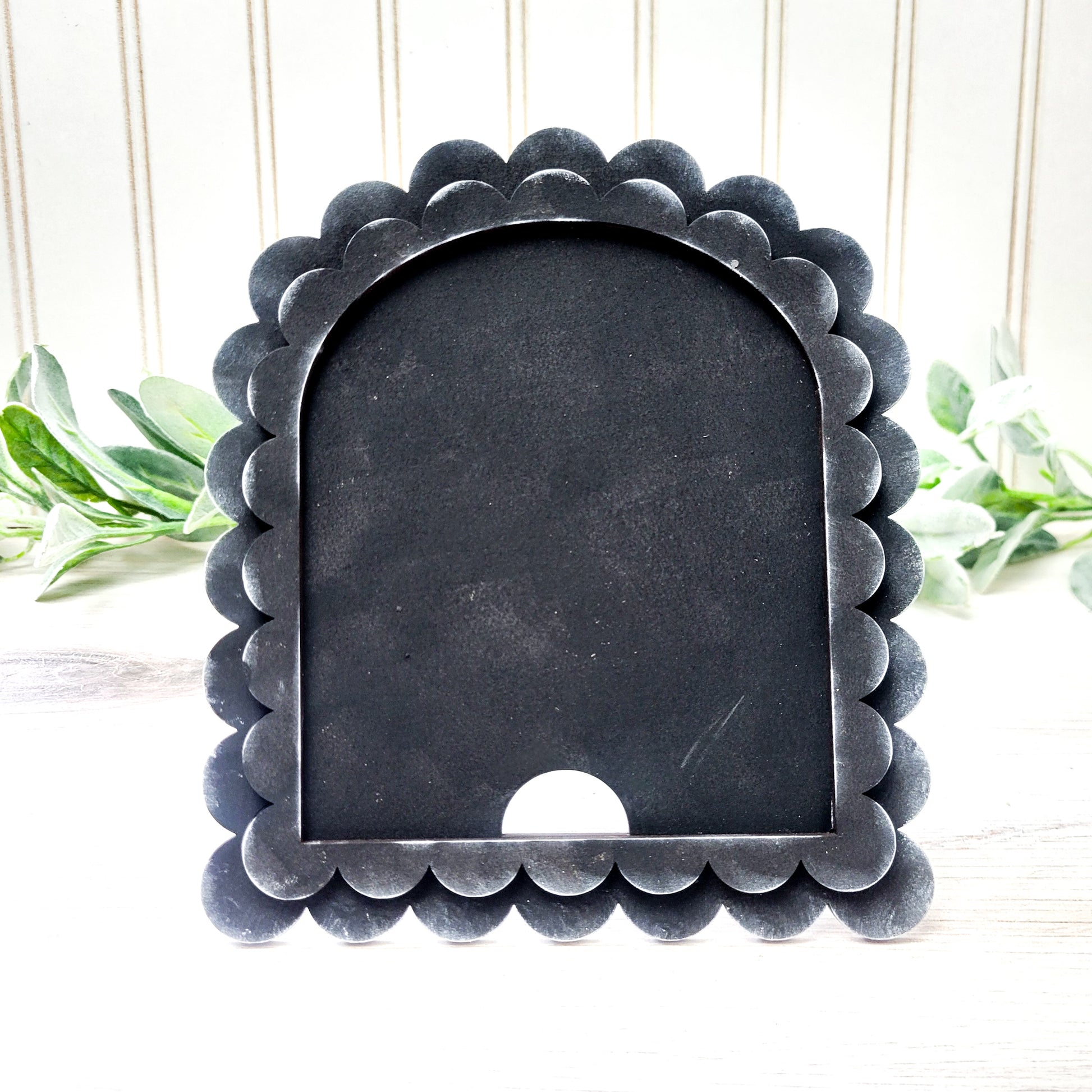 Turn up the whimsy with this double scalloped interchangeable frame! Featuring two layers of scalloped edges, this frame adds extra personality and visual interest to any space. It’s the same size as our other frames, making it fully compatible with all of our interchangeable arch inserts (sold separately), but with a little extra flair. Whether you're going bold, sweet, or festive, this frame is a standout centerpiece for your tiered tray or shelf. Measures 6.75" tall and 6" wide and comes with a kickstand so it will stand up on it's own.