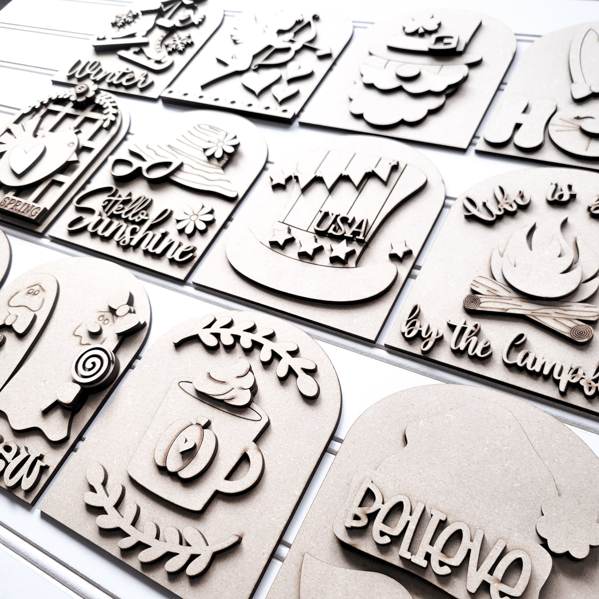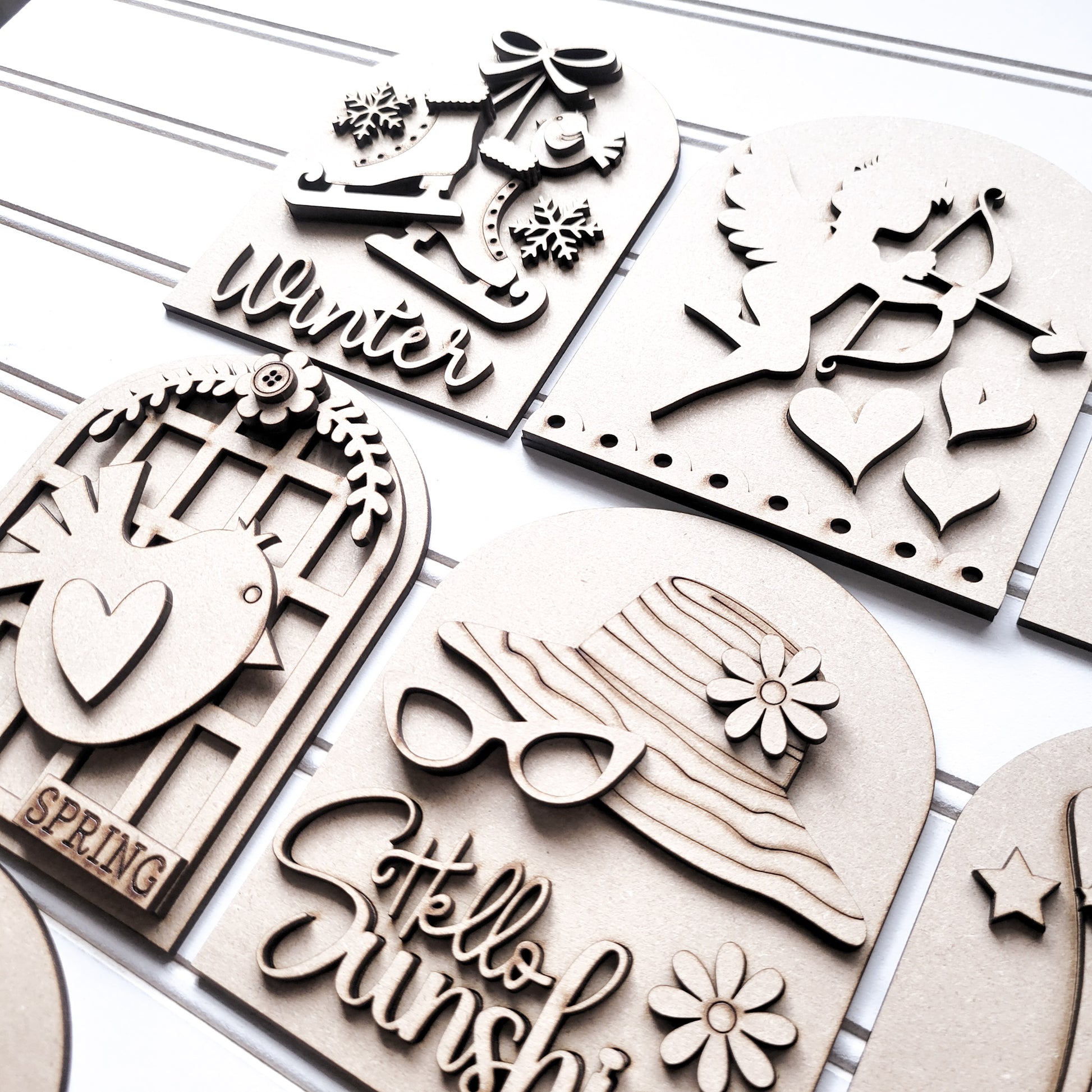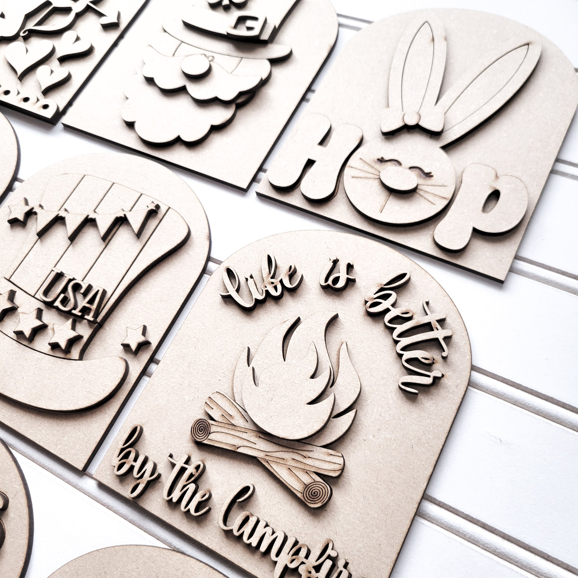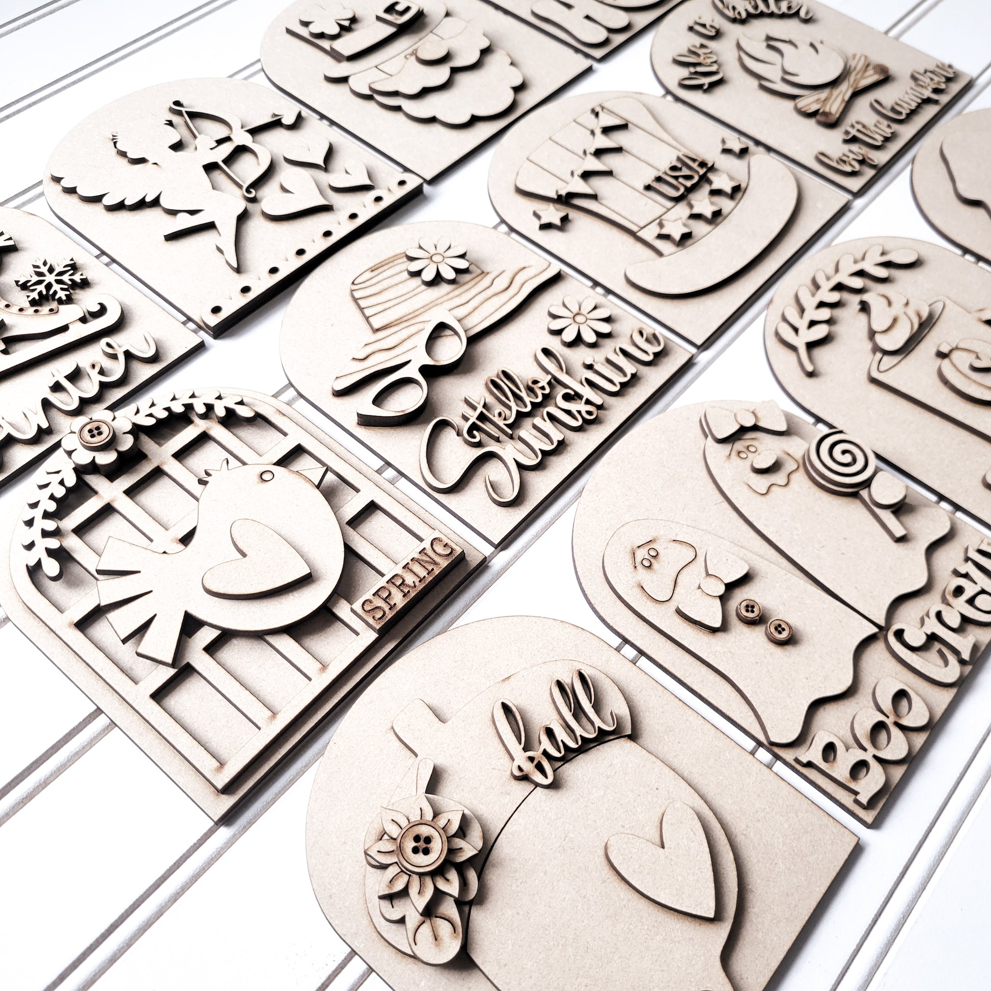 These seasonal inserts are made to fit perfectly inside our interchangeable arched frames (sold separately), making it easy to refresh your decor for any holiday or celebration! Each insert is laser-cut from smooth MDF and comes ready to paint, decorate, and personalize. Whether you're crafting solo or hosting a paint night with friends, you'll love how simple it is to swap out inserts and bring new life to your home decor again and again. Signs measure approximately 5.25" tall by 4.5" wide and fit perfectly inside any of our arched frames.