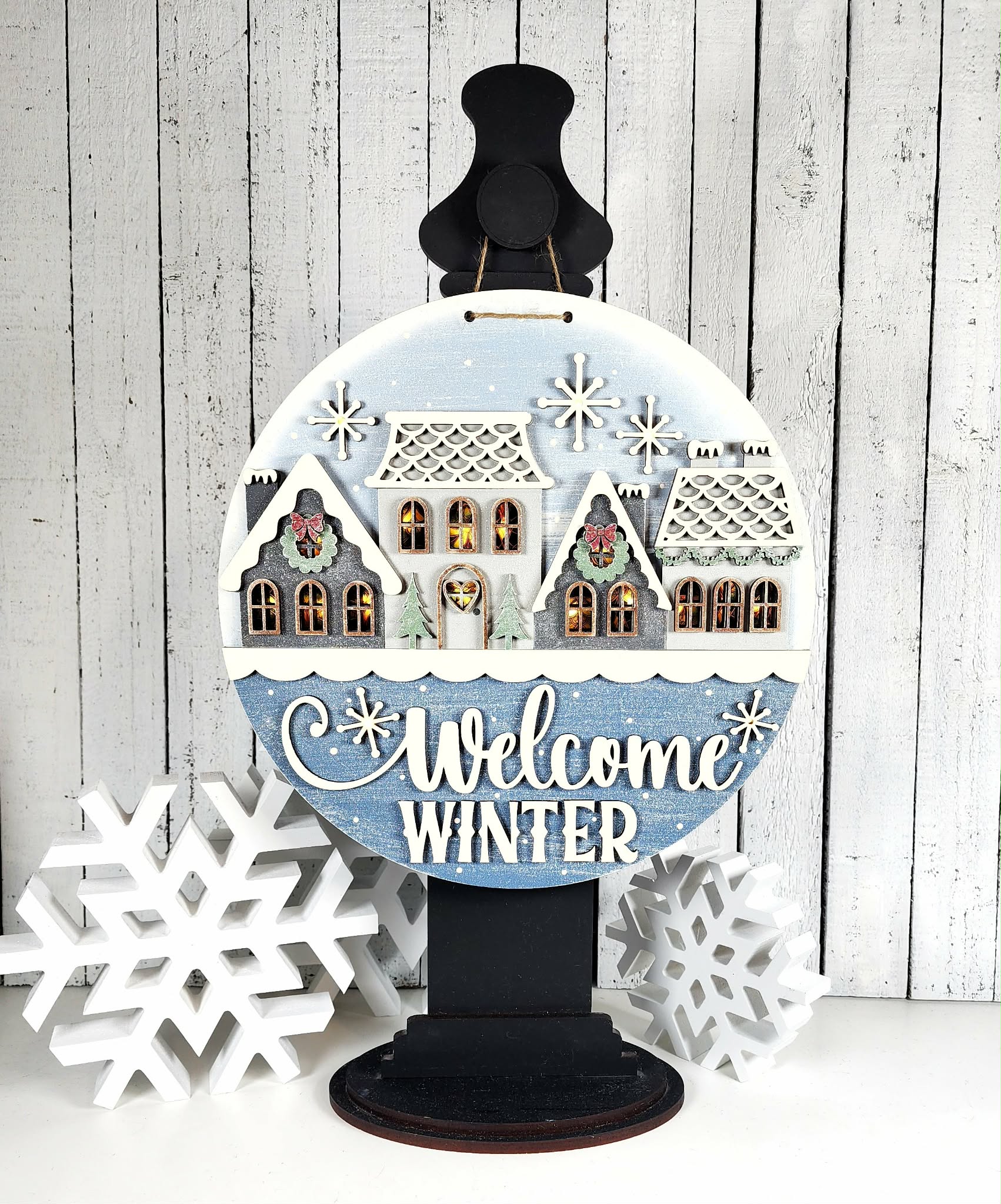 Each piece is laser-cut for crisp detail and easy painting—making it a fun, relaxing project for beginners and experienced crafters alike. Display it on your front door, hang it in an entryway, or prop it on a stand for an indoor winter vignette.